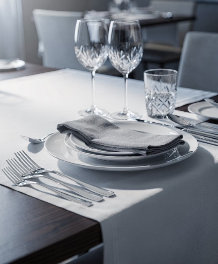 - 식사 끝: 나이프 날이 안쪽을 향하게 하여 포크와 함께 4시 방향으로 나란히 둡니다. (치워달라는 신호)