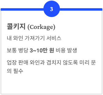 - 콜키지(Corkage) 확인: 내가 가져온 와인을 마실 수 있는 서비스입니다. 보통 병당 3~10만 원의 비용이 발생하며, 업장에서 판매하는 와인과 겹치지 않아야 하는 경우도 있으니 미리 문의하세요.