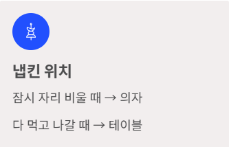 - 자리를 잠시 비울 땐 냅킨을 '의자'에, 다 먹고 나갈 땐 '테이블'에 둔다.