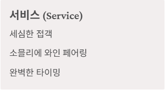 - 🤵 서비스 (Service): 물잔이 비지 않게 채워주는 세심함, 전문 소물리에의 와인 페어링 등 고도의 접객 서비스.