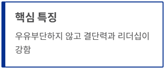- 우유부단하지 않고 결단력과 리더십이 강한 것이 가장 큰 특징이다.