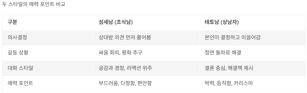 💡 참고: 두 유형은 옳고 그름의 문제가 아니라 성향의 차이입니다. 최근에는 너무 우유부단한 것에 지쳐, 시원시원한 테토남에게 매력을 느끼는 분들이 늘고 있다고 해요.