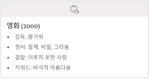 - 줄거리: 1962년 홍콩, 같은 날 같은 아파트로 이사 온 첸 부인(장만옥)과 차우(양조위). 두 사람은 각자의 배우자가 서로 외도를 하고 있다는 충격적인 사실을 알게 됩니다. 배신감 속에서 서로를 위로하다가 겉잡을 수 없는 사랑에 빠지게 되죠.