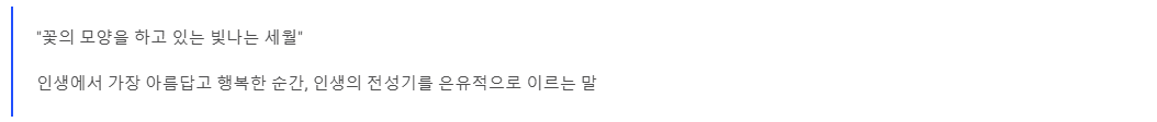 즉, 꽃이 만개하듯 '인생에서 가장 아름답고 행복한 순간' 또는 '인생의 전성기(황금기)'를 은유적으로 이르는 말입니다.