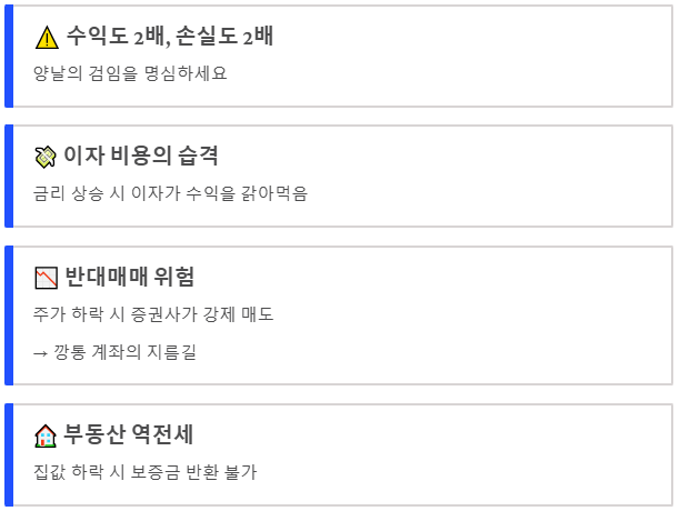 - 반대매매 위험: 주식의 경우, 주가가 일정 수준 이하로 떨어지면 증권사가 강제로 내 주식을 팔아 빚을 회수해버립니다. (깡통 계좌의 지름길)