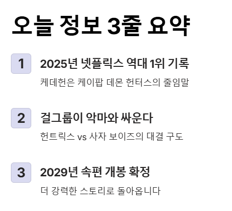 케데헌 뜻, 아직도 모르시나요? 2025년 넷플릭스를 강타하며 역대 시청 1위를 기록한 '케이팝 데몬 헌터스'의 줄거리, 흥행 비결, 그리고 2029년 확정된 속편 정보까지 완벽하게 정리해 드립니다.