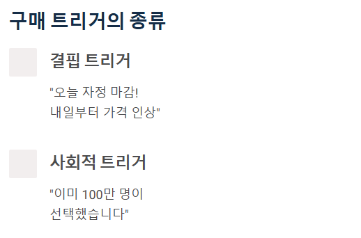 - 결핍 트리거: "오늘 자정 마감! 내일부터 가격 인상" (손해 보기 싫은 심리 자극)