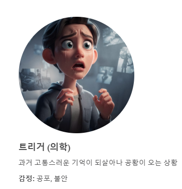 - 의미: 평소에는 괜찮다가도, 과거의 끔찍한 기억(트라우마)을 순식간에 재경험하게 만드는 '특정 자극'입니다.