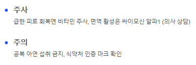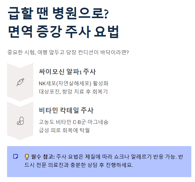 - 주사: 급한 피로 회복엔 비타민 주사, 면역 활성은 싸이모신 알파1(의사 상담).