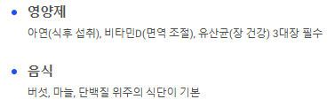 - 영양제: 아연(식후 섭취), 비타민D(면역 조절), 유산균(장 건강) 3대장은 필수.