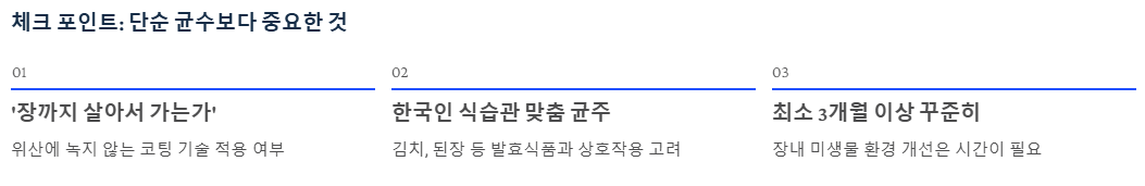 - 체크 포인트: 단순히 균수(CFU)가 많은 것보다 중요한 것은 '장까지 살아서 가는가'입니다. 위산에 녹지 않는 코팅 기술이 적용되었는지, 한국인 식습관에 맞는 균주인지 꼭 확인하세요.