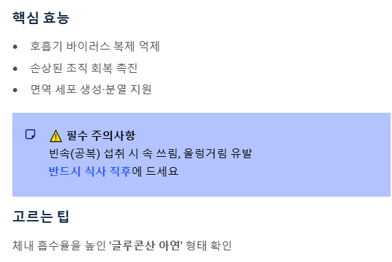 - 핵심 효능: 호흡기 바이러스 복제를 억제하고, 손상된 조직 회복을 돕습니다.