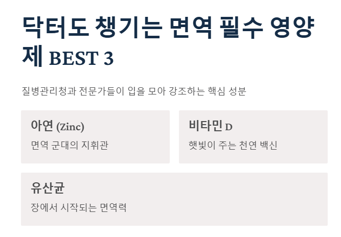 면역 관련 제품은 정말 많지만, 질병관리청이나 전문가들이 입을 모아 강조하는 성분은 정해져 있습니다. 이것저것 다 챙기기 어렵다면, 딱 이 3가지만 기억하세요.