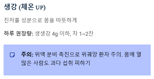 - 하루 권장량: 생생강 기준 4g 이하 (엄지손톱 크기 정도), 차로는 1~2잔.
