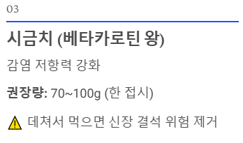 - ⚠️ 주의사항: '옥살산(수산)' 성분이 있어 생으로 과다 섭취 시 신장 결석 위험이 있습니다. 끓는 물에 살짝 데쳐 먹으면 옥살산이 대부분 제거됩니다.