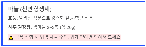 - ⚠️ 주의사항: 공복에 생마늘을 많이 먹으면 위벽을 자극해 속 쓰림이나 위염을 유발할 수 있습니다. 위가 약하다면 익혀 드세요.