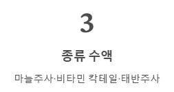 - 마늘 주사 (비타민 B1): 마늘 냄새가 살짝 올라오며, 만성 피로와 근육통 해소에 즉각적입니다.