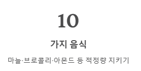 - 음식: 마늘(2쪽), 아몬드(한 줌), 브로콜리(데쳐서) 등 과유불급을 지켜 섭취하세요.