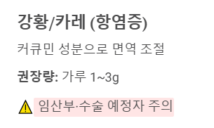 - 하루 권장량: 강황 가루 1~3g (티스푼 1개).