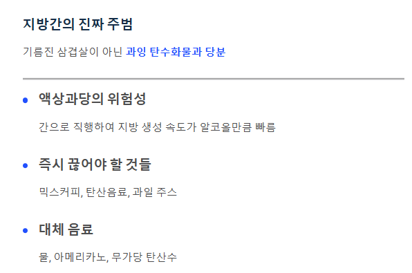 '과잉 탄수화물과 당분'입니다. 섭취 후 쓰고 남은 탄수화물은 중성지방 형태로 간에 저장됩니다. 특히 음료수에 들어가는 액상과당은 간으로 직행하여 지방을 생성하는 속도가 알코올만큼 빠릅니다.