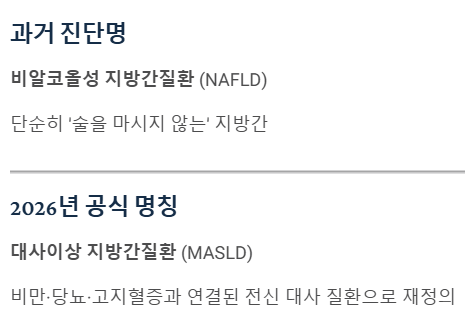 최근 대한간학회를 비롯한 국제 학계에서는 비알코올성 지방간질환(NAFLD)의 명칭을 대사이상 지방간질환(MASLD)으로 공식 변경했습니다. 이는 지방간을 단순한 간의 문제가 아닌, 비만·당뇨·고지혈증과 한 묶음으로 움직이는 '전신 대사 질환'으로 규정했다는 강력한 시그널입니다.