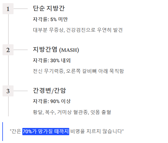 | 단순 지방간 (Steatosis) | 대부분 무증상. 건강검진 혈액검사(ALT/AST 수치 상승)나 복부 초음파로 우연히 발견됨. | 5% 미만 |