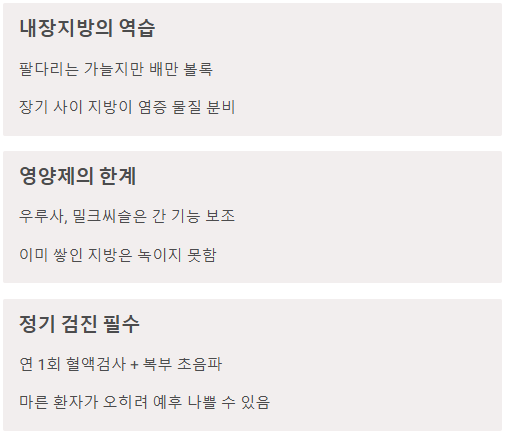 - 영양제의 한계: 우루사(UDCA)나 밀크씨슬은 간 기능을 보조할 뿐, 이미 쌓인 지방을 녹여주지는 못합니다. 식단 조절 없이 영양제만 믿는 것은 밑 빠진 독에 물 붓기와 같습니다.