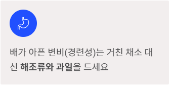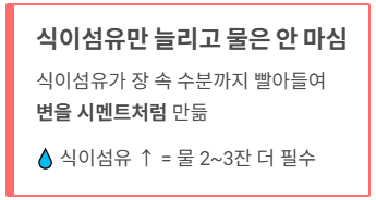 | 추천 식이섬유 | 불용성 식이섬유 (부피 증가) | 수용성 식이섬유 (부드럽게 이완) |