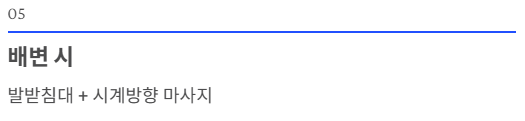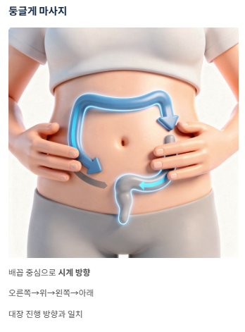 - 둥글게 마사지: 배꼽을 중심으로 시계 방향(오른쪽→위→왼쪽→아래)으로 문지르면 대장의 진행 방향과 일치해 변 이동을 돕습니다.