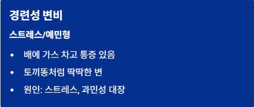 | 구분 | 이완성 변비 (장 운동 저하) | 경련성 변비 (스트레스/예민) |