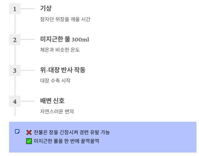 - 실천법: 일어나자마자 미지근한 물을 한 번에 300ml 정도(머그컵 1잔 가득) 꿀꺽꿀꺽 마셔 장에 물리적인 압력을 가하세요.