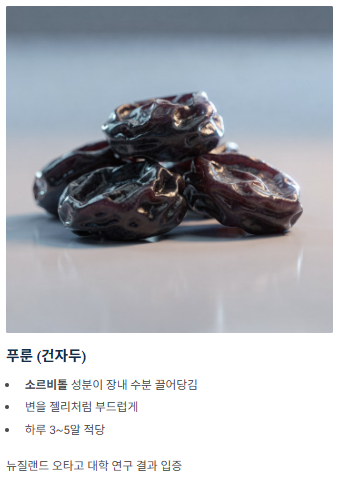 - 푸룬(건자두): '소르비톨' 성분이 장내로 수분을 끌어들여 변을 젤리처럼 만듭니다. 성인 기준 하루 3~5알이 적당하며, 과다 섭취 시 설사를 유발할 수 있으니 주의하세요.