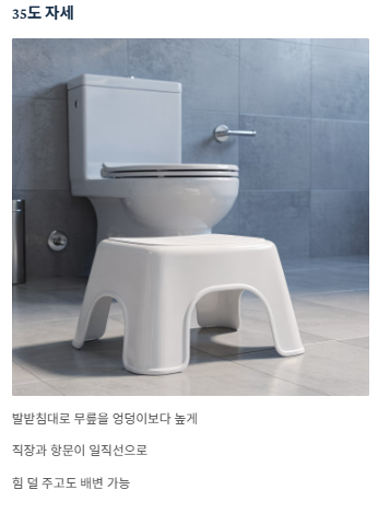 - 35도 자세: 좌변기에 앉을 때 발받침대를 사용하여 무릎을 엉덩이보다 높게 올리세요. 직장과 항문이 일직선으로 펴지는 해부학적 각도가 완성되어 힘을 덜 주고도 배변이 가능해집니다.