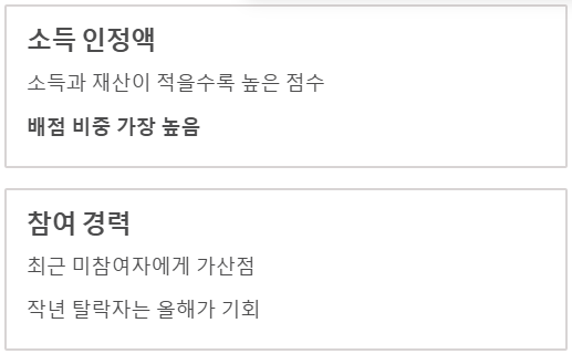 - 소득 인정액 (배점 비중 높음): 신청자의 소득과 재산이 적을수록 높은 점수를 받습니다.
