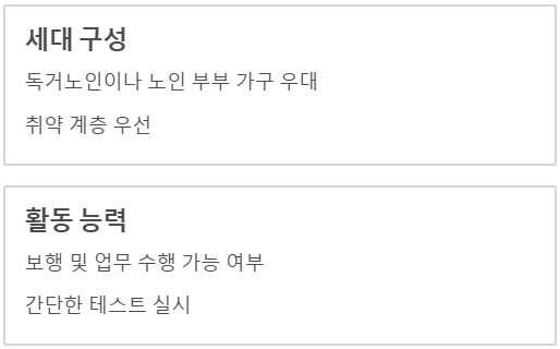 - 독거노인이나 노인 부부만 사는 가구는 자녀와 함께 사는 가구보다 높은 점수를 받습니다. 부양할 가족이 없거나 돌봄이 필요한 취약 계층을 우선하기 때문입니다.