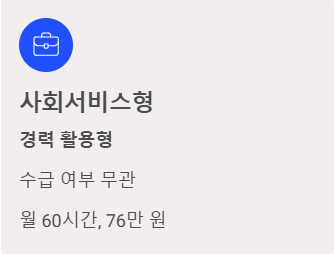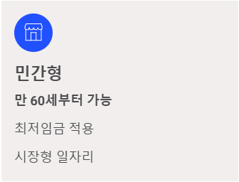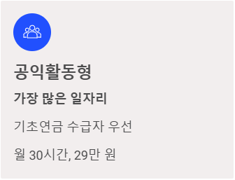| 활동 내용 | 스쿨존 교통지도, 환경미화 | 보육시설/공공기관 업무지원 | 실버카페, 택배, 제조, 판매 |