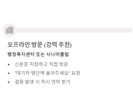 - 오프라인 방문 (강력 추천): 인터넷 사용이 어려우시다면 신분증을 지참하시고 거주지 관할 행정복지센터(동사무소)나 지역 시니어클럽을 방문하세요.