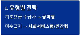 - 유형별 전략: 기초연금 수급자는 '공익형', 미수급자는 '사회서비스형/민간형' 지원 가능.