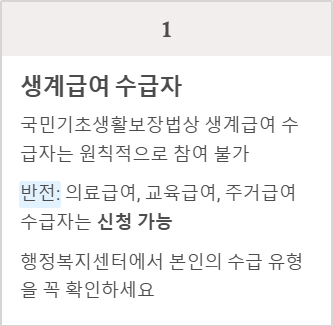 - 가장 중요한 포인트입니다. '생계급여' 수급자는 원칙적으로 참여가 불가능합니다.