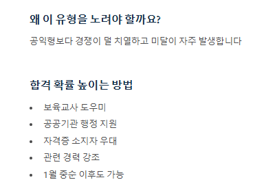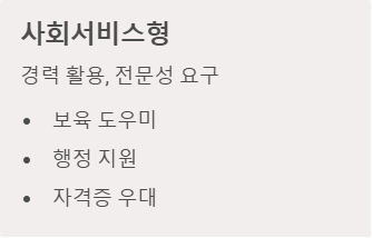 - ✅ 이렇게 하세요: 보육교사 도우미, 공공기관 행정 지원 등 사회서비스형은 자격증 소지자나 관련 경력자를 우대하므로 미달이 나는 경우가 종종 있습니다. 본인의 과거 경력을 이야기하며 지원하면 1월 중순 이후에도 취업 성공 확률이 높습니다.