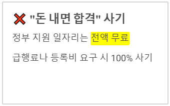 - 정부 지원 노인 일자리는 신청부터 선발, 교육까지 전액 무료입니다. 급행료나 등록비 명목으로 돈을 요구하는 곳은 무조건 피하세요.