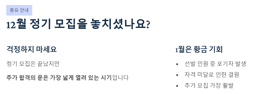 - 현재 상황: 12월 정기 모집은 마감됐으나, 1월은 추가 모집 및 대기자 등록 시즌.