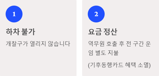 - 요금 정산: 역무원을 호출해 승차역~하차역 전 구간 운임을 별도로 지불해야 합니다. (기후동행카드 혜택 소멸)