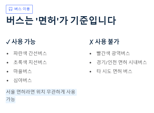 - 불가능: 빨간색(광역버스), 경기/인천 면허 시내버스, 타 시도 면허 버스