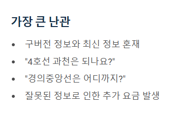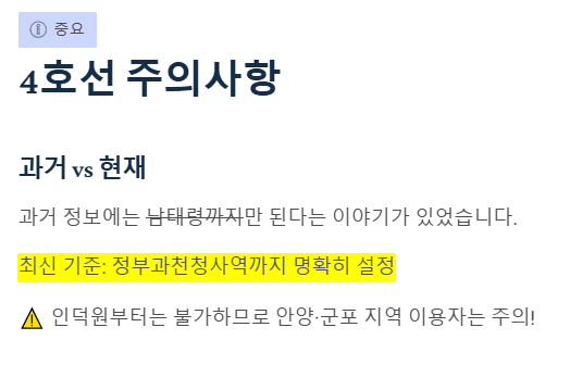 - 4호선(과천/진접), 1호선 등 경계가 있는 노선은 반드시 하차 역을 미리 확인한다.