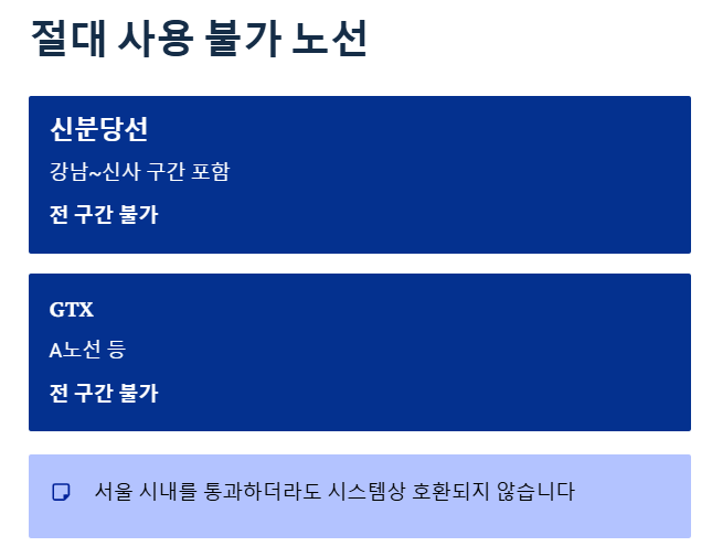 아래 노선은 서울 시내를 통과하더라도 시스템상 호환되지 않습니다.