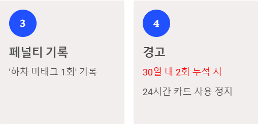 - 경고: 하차 미태그가 최근 30일 내 2회 누적되면, 24시간 동안 카드 사용이 정지됩니다.
