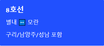 - 8호선: 전 구간 (별내~모란) ※ 구리/남양주/성남 구간 완전 포함