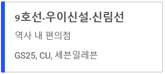 - 9호선/우이신설/신림선: 역사 내 편의점 (GS25, CU, 세븐일레븐 등)