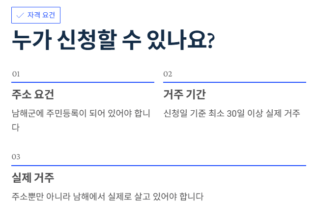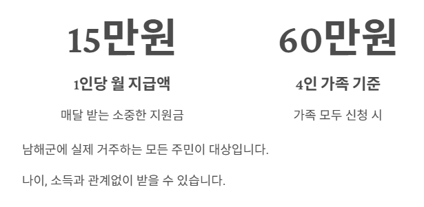 - 주소는 남해지만 실제로는 다른 곳에 사는 사람, 혹은 어디에 사는지 명확하지 않은 경우 현장 조사를 통해 지급이 거절될 수 있습니다.